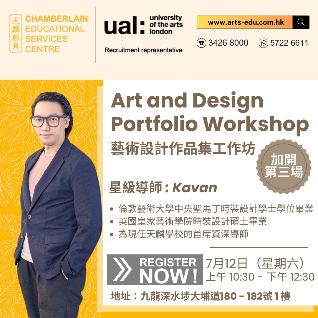 因應五月和六月的工作坊反應熱烈,我們天麟學校(西九龍)決定於7月舉辦第三場藝術設計作品集工作坊!其內容將保持不變,導師Kavan(倫敦藝術大學中央聖馬丁時裝設計學士學位畢業,為現任天麟學校的首席資深導師)亦會在工作坊中為學生提供寶貴的指導。