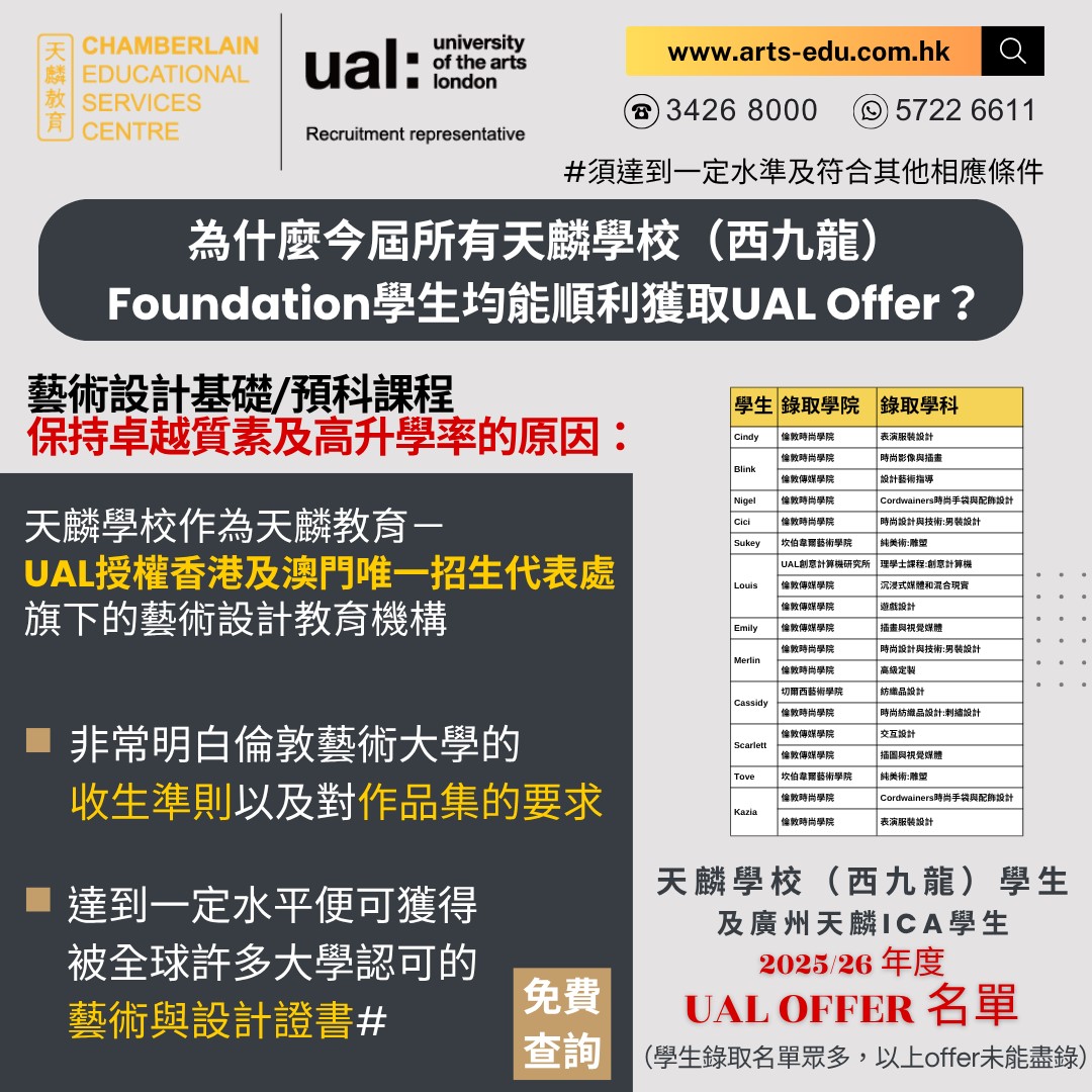 2025.08.29 重要通知: 天麟教育將停辦在香港的倫敦藝術大學 (UAL) 招生代表 (內地業務維持不變) 2025.07.31 【造就今屆天麟學校(西九龍)所有foundation學生獲取UAL offer 的優秀導師團隊】 2025.07.17 【DSE放榜 探索英國升學機會 免費一對一查詢!】 2025.07.17 【參加倫敦藝術大學網上講座,進一步了解UAL,準備好迎接新的挑戰!】 2025.07.11 【UCAS Clearing 2025 📣 把握升讀英國大學的最後機會👩🎓】