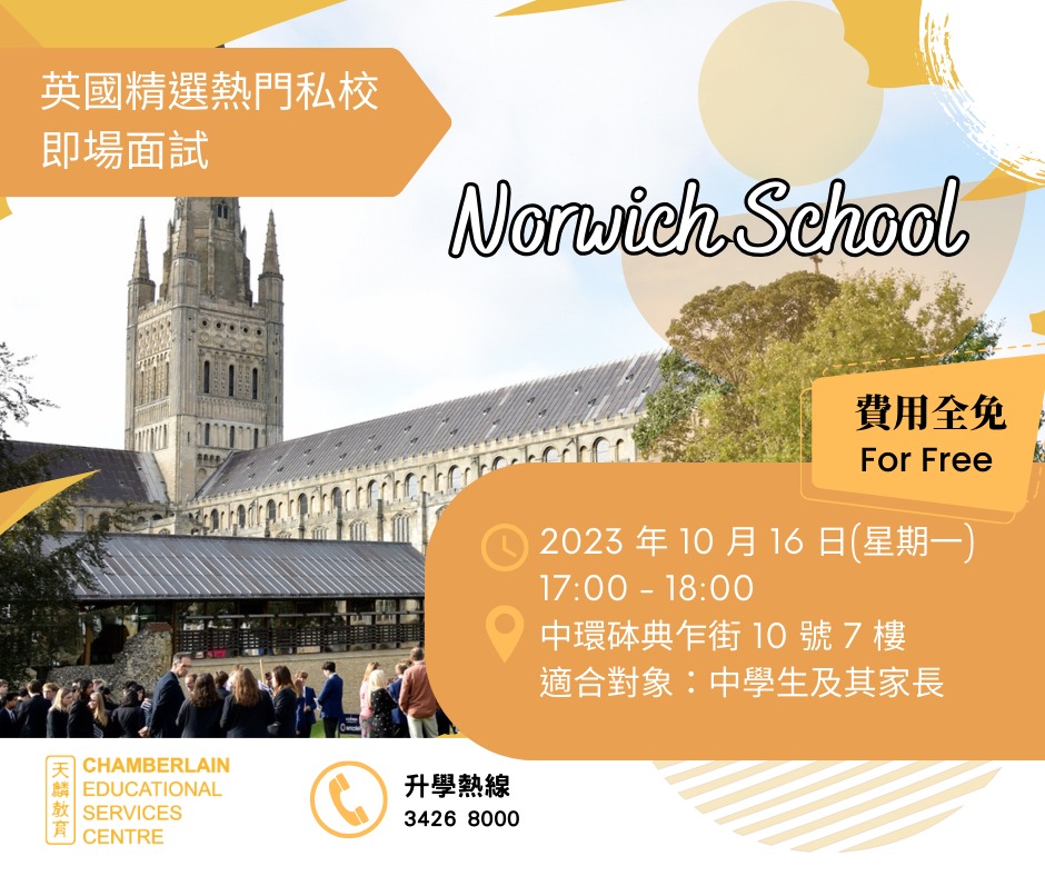 Norwich School 代表將於 10 16 日親臨香港舉辦面試招生日,學生如準備今年到英國修讀 A Level,請儘快與我們聯絡,面試請帶同成績表及相關文件。期待與你共同探索這個令人驚喜的教育旅程!👀更多活動即上: