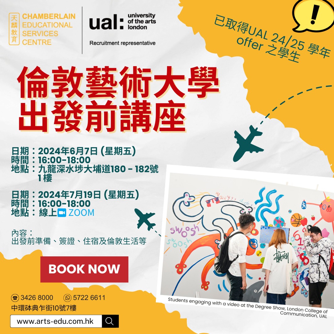 我們衷心祝賀所有已經獲得倫敦藝術大學(UAL)offer的同學,期待他們在UAL展開一段愉快的求學之旅,追求夢想的道路愈走愈精彩💖!為了讓同學們更好地融入大學生活,倫敦藝術大學授權香港及澳門唯一招生代表處 - 天麟教育特別舉辦了出發前講座,提供相關指引,助大家提前做好大學生活準備,還可以認識其他獲得UAL offer的同學🙌🏼。同學們記得盡快報名!千萬不要錯過!