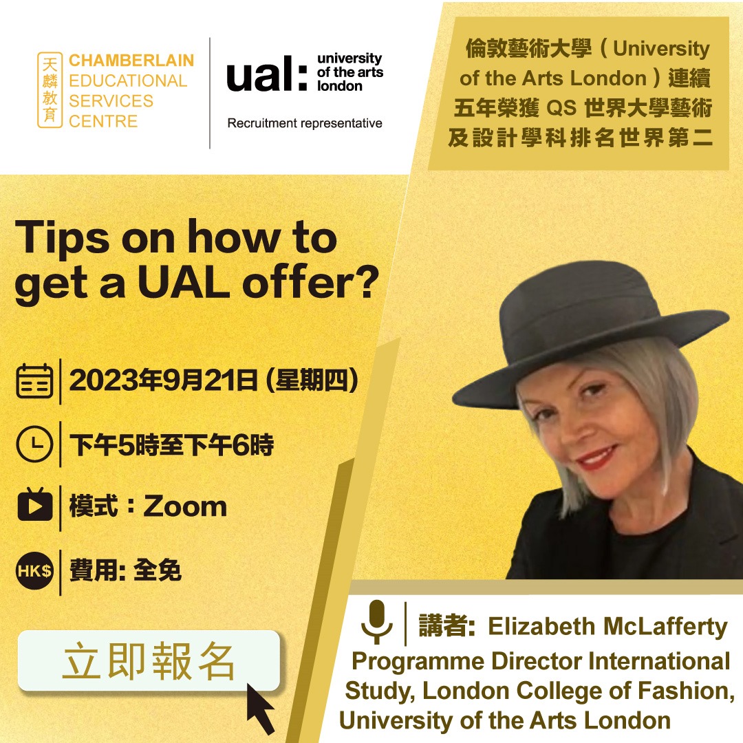 UAL將舉辦一個主題為「Tips on how to get a UAL offer?」的線上講座。倫敦藝術大學香港及澳門授權唯一招生代表處邀請了倫敦藝術大學的面試官為同學分享有關如何獲得UAL錄取的貼士和建議,使同學在眾多申請者中脫穎而出。
