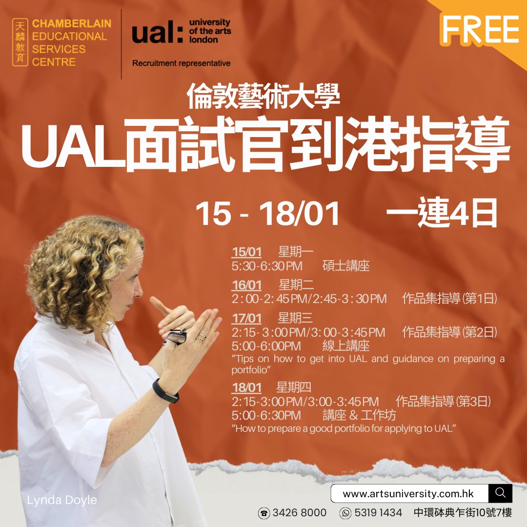 倫敦藝術大學連續五年榮獲 QS 世界大學藝術及設計學科排名第二🏆,校友包括不少知名藝術家及設計師。想爭取下學年入讀 UAL 的基礎、學士、碩士課程?馬上把握黃金機會!🔥 🔥由 1 月 15 日至 18 日,倫敦藝術大學 UAL 面試官 Lynda Doyle 將到港親自為有意報讀 UAL 的同學主持作品集指導、講座及工作坊!所有活動費用全免,名額有限,報名即上👉:
