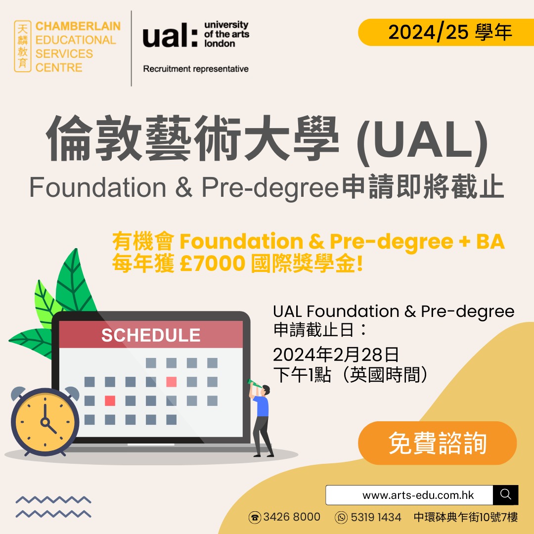 📣倫敦藝術大學 (UAL) 2024/25學年秋季入學的Foundation & Pre-degree之申請將於2月28日截止!為培育藝術設計人才,UAL特別為入讀Foundation和Pre-degree並符合資格的學生提供每年£7,000國際獎學金,獎學金資助更持續至BA課程💰!仍未遞交申請或想了解取得獎學金資格的同學,請儘快致電34268000或WhatsApp 53191434,聯絡倫敦藝術大學授權香港及澳門唯一招生代表處以獲取官方申請指引,我們將繼續免費協助同學們提交UAL的申請❤️。