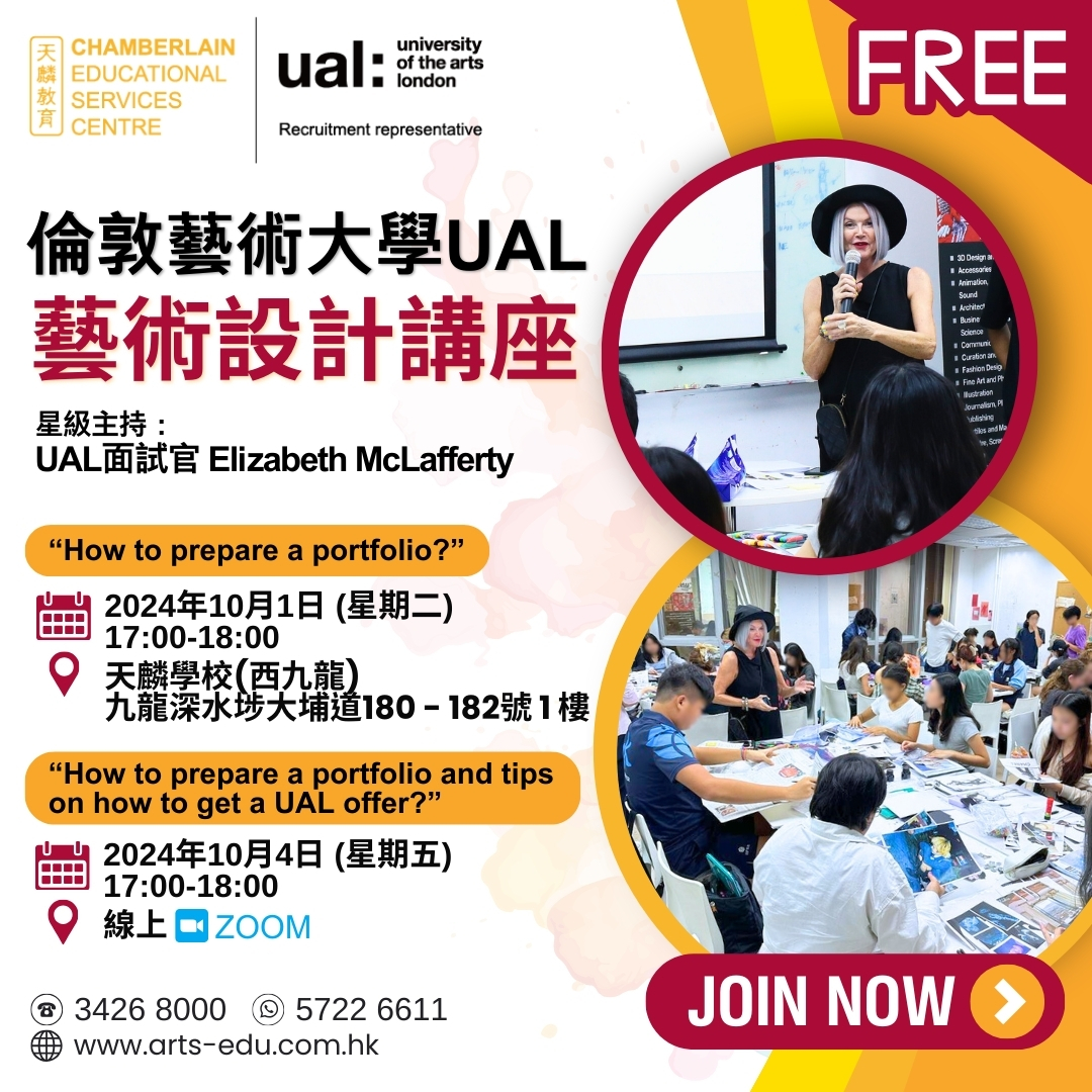 一份出色的作品集隨時等同進入世界頂尖藝術設計大學的入場券💎!想提升作品集水平,最直接方法當然是取得大學面試官的評價。🔥 🔥倫敦藝術大學UAL面試官Elizabeth McLafferty將於10月1日(星期二)及4日(星期五)親自為有意報讀UAL的同學主持講座。活動費用全免,名額有限,報名👉: