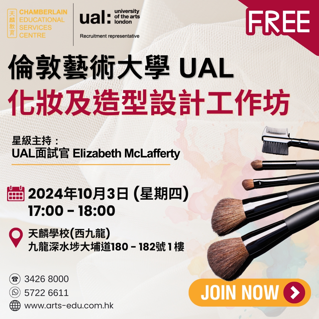 號外!號外!鍾情化妝、造型設計並夢想入讀殿堂級藝術設計學院的你,絕對不容錯過UAL的最新活動!倫敦藝術大學授權香港及澳門唯一招生代表處特邀倫敦藝術大學UAL面試官Elizabeth McLafferty103(星期四)親自為同學們主持化妝及造型設計工作坊。活動費用全免,名額有限,報名👉