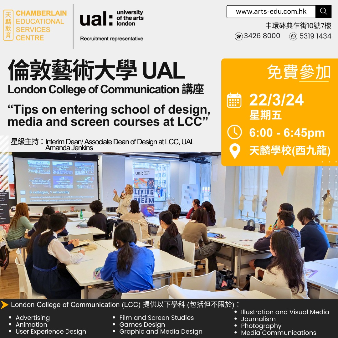 of Design at LCC, UAL)将于3月22日到天麟学校(西九龙)为有意报读LCC的同学主持讲座