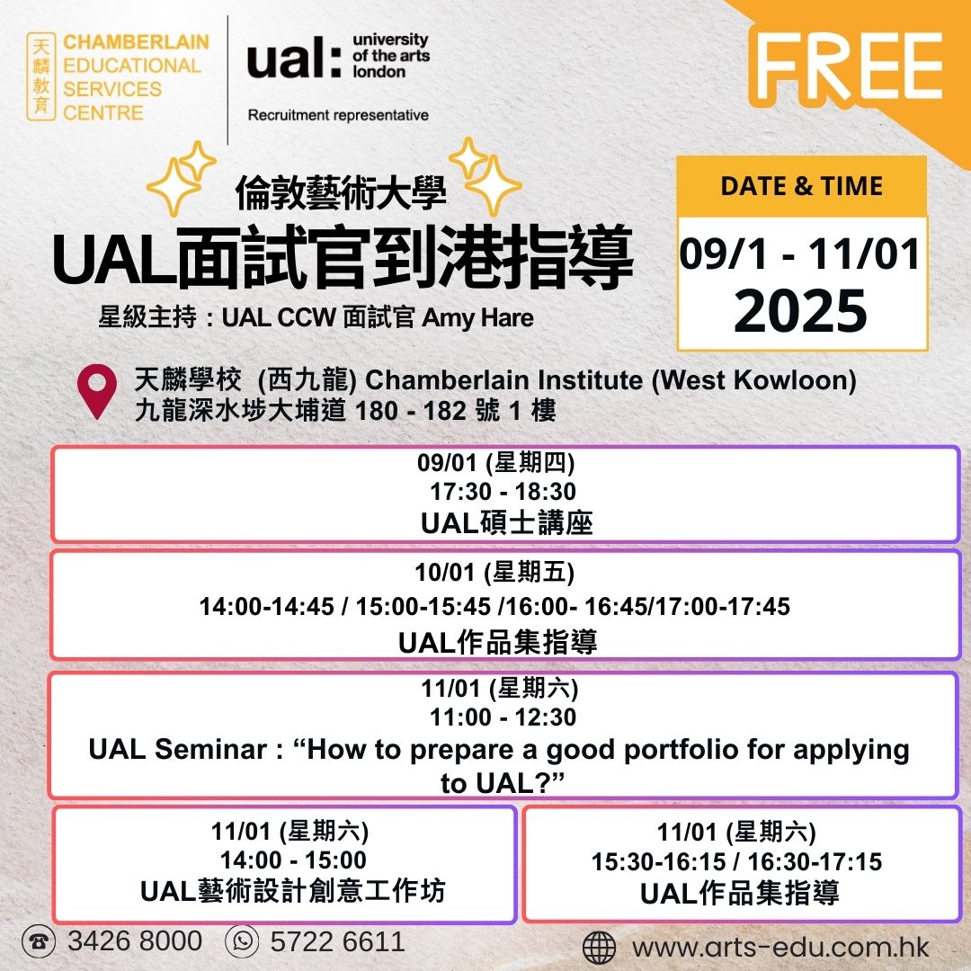 天麟教育 - 伦敦艺术大学授权香港及澳门唯一招生代表处,协助有意入读伦敦艺术大学的同学,提供入学咨询、艺术设计作品集指导建议等。如果对准备艺术设计作品集有任何疑问,欢迎联络我们。