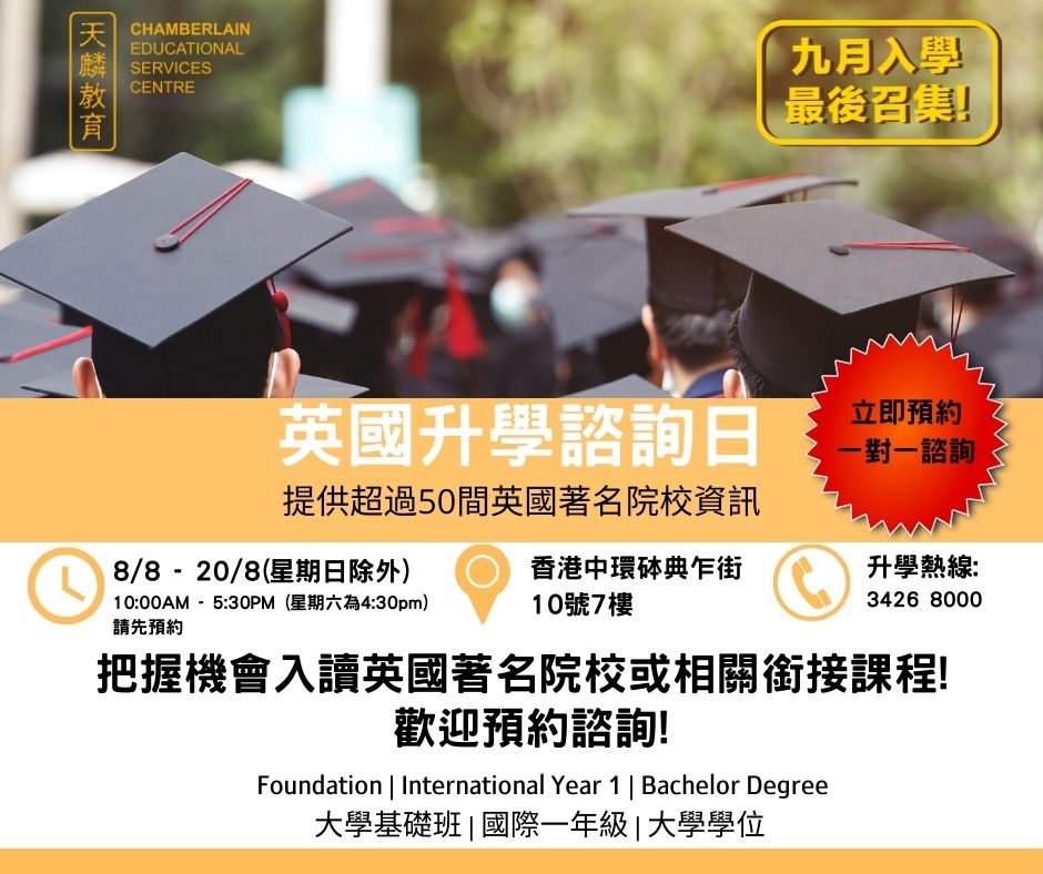 天麟教育明白同学们的需要,特别举办「英国升学咨询日」,为同学提供超过50间英国著名院校或相关衔接课程的信息,欢迎同学们马上预约,把握9月入学最后机会!