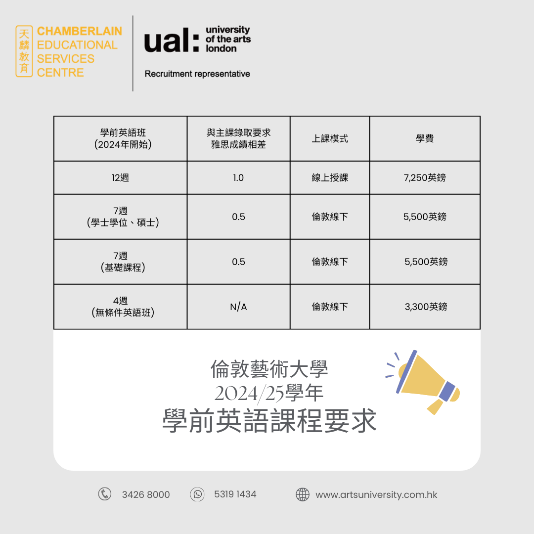 如同学们获得录取但英语考试成绩尚未达到录取条件,可以考虑报读伦敦艺术大学学前英语班,课程结束后直接参加校内英语测试,通过后可作为满足主课程英语条件的凭证,无需再次参加其它英语考试。如有疑问或想报读,请联络天麟教育 - 伦敦艺术大学授权香港及澳门唯一招生代表处。