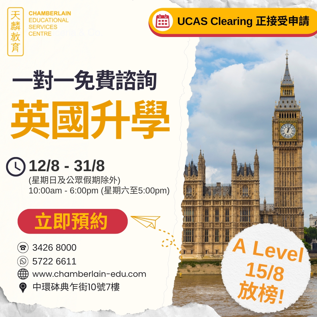 ✨天麟教育明白同學們的需要,特別為應屆A Level畢業生提供英國升學一對一免費諮詢服務,分享有關入讀英國著名院校或相關銜接課程的資訊。歡迎同學聯絡我們,把握升學機會💪!