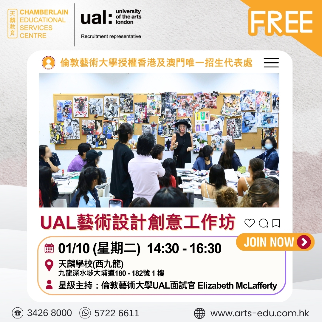 想申請入讀倫敦藝術大學,一份能夠展現個人風格的作品是必不可少的!為了讓同學們更好地優化作品,倫敦藝術大學授權香港及澳門唯一招生代表處特邀倫敦藝術大學UAL面試官Elizabeth McLafferty於10月1日(星期二)為同學們主持藝術設計創意工作坊。面試官將帶領同學們沉浸式感受倫敦藝術大學的創意教學,助同學們今後更有方向性地準備申請作品,想申請UAL的你不能錯過!活動費用全免,名額有限,報名👉: