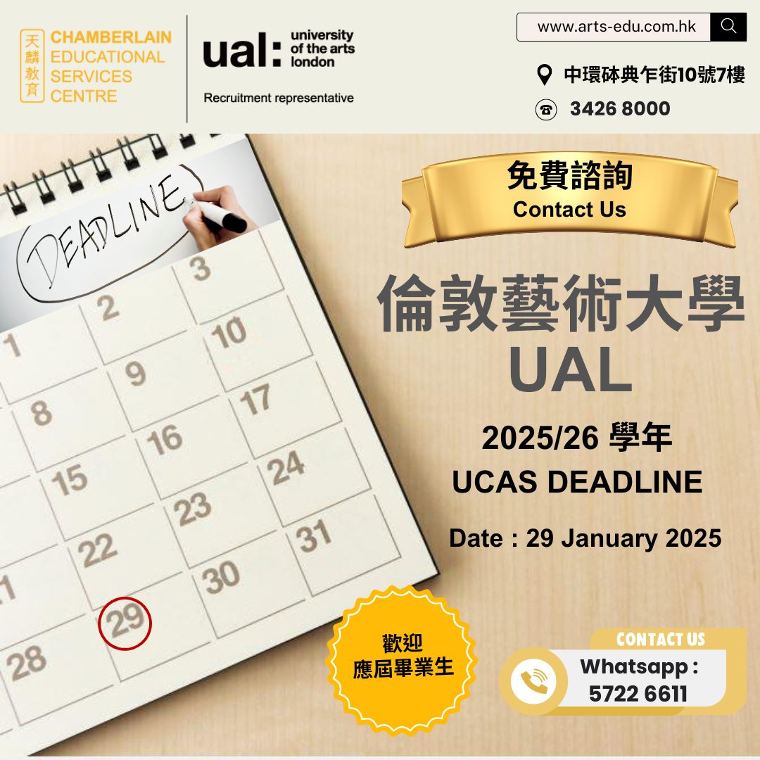 今年的UCAS申請日期將於2025129日截止,由於競爭非常激烈,同學應盡快與我們聯絡,以了解申請的流程和所需文件。歡迎應屆畢業生致電34268000WhatsApp 57226611,預約倫敦藝術大學香港及澳門唯一招生辦事處 - 天麟教育作免費諮詢。