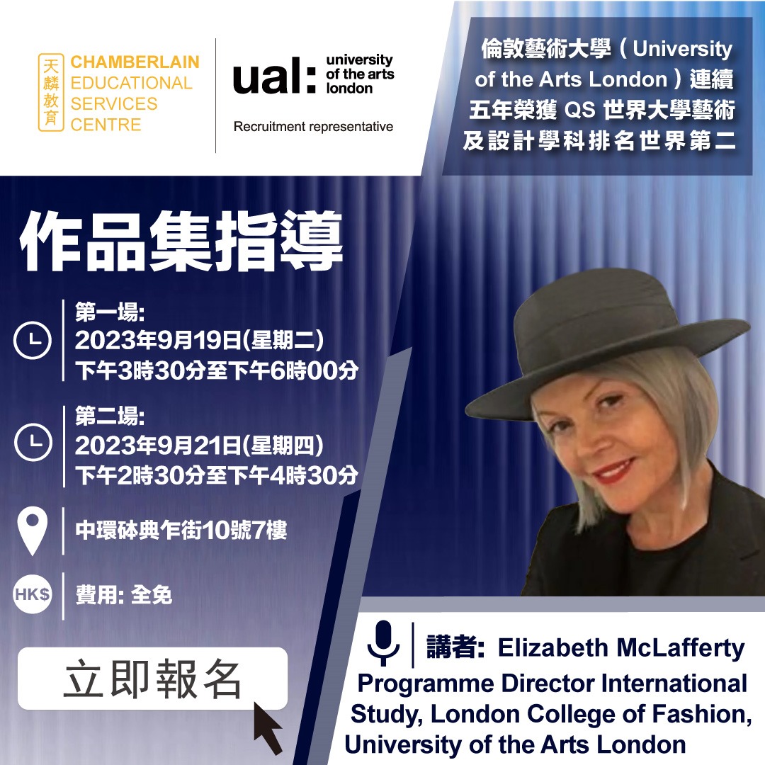 親愛的藝術愛好者們,如果你夢想是報讀QS世界大學藝術及設計學科排名第二的倫敦藝術大學,我們有一個令人興奮的消息要與大家分享!我們很榮幸地宣布,來自UAL的Elizabeth McLafferty (Programme Director International Study, London College of Fashion) 將於9月19日及21日為有意報讀UAL的同學提供兩場獨家的作品集指導。